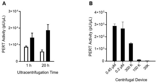 Size filtration. Sf9 supernatant (400 μL; 0.45 μm filter) was filtered using 0.2 μm, 300 K, 100 K, 30 K Nanosep centrifugal devices (Catalogue number: ODPTFE02C34, OD 300C33, OD100C33, OD030C33, respectively; Pall, Port Washington, NY, USA) and centrifuged at 12,000× g for 5–15 min until no fluid remained on top of the filter unit. The filtrates were collected and 10 μL was aliquoted for the PERT assay.