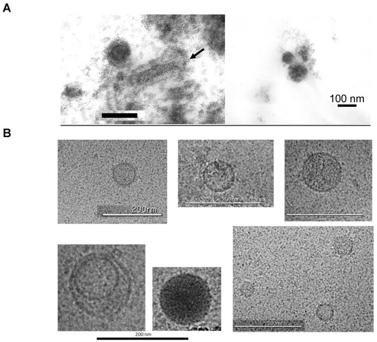 TEM analysis indicated that some spherical retrovirus-like particles, about 65–110 nm in diameter, were seen in thin-sections that were prepared from the ultracentrifuged pellet of Sf9 supernatant (Figure 4A). Some resembled the 50 nm type A retroviral-like particles previously described to be present in D. melanogaster cells [13]. The bacilliform Sf-rhabdovirus of about 170 to 190 nm in length, which was described previously [24], was also observed in the same image (Figure 4A, left panel, indicated by the arrow). Cryo-EM showed 40–120 nm unilamellar spherical particles that appeared to have a textured appearance and proteinaceous material on their surface (Figure 4B). Additionally, a few spherical particles contained highly electron-dense structures (Figure 4B, lower middle panel) and some were present inside larger vesicles (Figure 4B, lower left panel). Rod-like Sf-rhabdovirus with a scaled appearance, which has been described previously, was present in the same sample (Figure 1F; [24]). The results from the EM analysis confirmed the heterogeneity in the size of the RT-particles produced extracellularly from Sf9 cells, which was also found using the Nanosep centrifugal devices (results shown in Figure 3B). The extracellular particles seen by electron microscopy indicated a mix of particles, including retroviral-like and possibly extracellular vesicles and exomes [31].