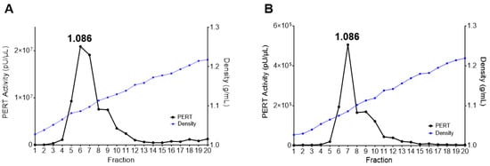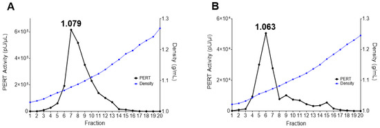 For the OptiPrep gradient, 2 mL of 48%, 38%, 28%, 18% and 8% of OptiPrep density gradient medium (Millipore Sigma, Burlington, MA, USA; catalogue number D1556), diluted in PBS, were layered from bottom to top in an ultracentrifugation tube (Beckman Coulter, Indianapolis, IN, USA; catalogue number 344059). For sucrose gradient, 2 mL of 60%, 45%, 30%, 15% and 0% of sucrose (Millipore Sigma, catalogue number S0389) dilutions in PBS were layered from bottom to top in an ultracentrifugation tube. For both gradients, the tube with 10 mL of OptiPrep or sucrose was sealed with parafilm and tipped over gently to a horizontal position for 45 min. Then, the tube was switched to a vertical position gently and the seal was removed. The sample (0.5 mL) was added on top of the gradient. The tubes were ultracentrifuged at 122,000× g (31,400 rpm; SW41 rotor) for 16 h at 4 °C with the highest deceleration setting. Fractions (0.5 mL) were removed from the top to bottom of the gradient. Forty microliters of each fraction were used to measure the refractive index with a refractometer (Reichert Amterk, Depew, NY, USA) for calculating the density. Ten microliter aliquots from each fraction were stored at −80 °C for the PERT assays.