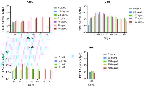 Sf9 cells (1.6 × 106; passage 23) were plated for 24 h in 25 cm2 flasks (to reach the beginning of the log phase based on the growth curve) before replacing the medium with medium containing different concentrations of AzaC (0, 1.25, 2.5, 5, 10, 20, 40 µg/mL), IUdR (0, 25, 50, 100, 200, 400 µg/mL), NaB (0, 0.25, 0.5, 1, 2, 4, 8, 16 mM) and TPA (0, 50, 100, 200, 400 ng/mL). After 48 h of drug treatment (equal to 1.25 times of the population doubling time of the cells) (designated as day 0), the cells were washed with medium three times and culturing continued with fresh complete medium. The culture was observed for cell toxicity and the medium was changed each day until the cells reached 95–100% confluence. The medium collected each day was filtered (0.45 μM filter; Corning, Corning, NY, USA catalogue number 430314) and 10 μL aliquots were stored at −80 °C for RT analysis using the PERT assay. Cells were set up in parallel without drug or with NH4OH (in the case of IUdR) and the medium collected was used as a negative control for the PERT assay.