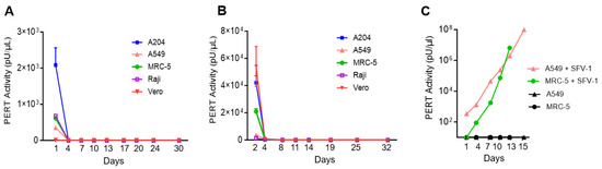 Infectivity analysis of Sf-RT particles. A204 cells, A549 cells, MRC-5 cells, Raji cells and Vero cells were inoculated with cell-free supernatant from (A) untreated Sf9 cells and (B) D2 (200 μg/mL) of IUdR-treated Sf9 cells. Filtered supernatant was collected from the inoculated cells at the first cell passage post-inoculation until its termination at day 30 or 32. (C) SFV-1 infected cells are shown as a positive control for retrovirus infection of A549 and MRC-5 cells; uninoculated cells are included as control. Samples were analyzed using the PERT assay.