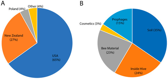Distribution of geographic locations and sources of 96 P. larvae phages. (A) The geographic locations of the 96 P. larvae phages. (B) Sources the P. larvae phages were isolated from.