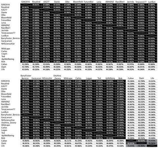Clustering of the New Zealand P. larvae phages was based on percent nucleotide identity (PNI) (Figure 2). Using a 60% PNI clustering cutoff, and 90% for belonging to a subcluster [23,24], we found evidence for two distinct clusters of phages in New Zealand. Callan, Dash, and Lilo form one cluster. Callan and Dash form a sub-cluster, while Lilo forms a separate sub-cluster due to relatively low PNI values with Callan and Dash at 73.49% and 79.81%, respectively. The remaining 23 phages form a separate cluster. Phages in this second cluster have a very high degree of similarity, ranging between 97.3% and 99.9% (Figure 2). A PNI similarity of more than 99.9% indicates that there are approximately 40 base pairs that differ between the two phages based on a ~40 kb genome.