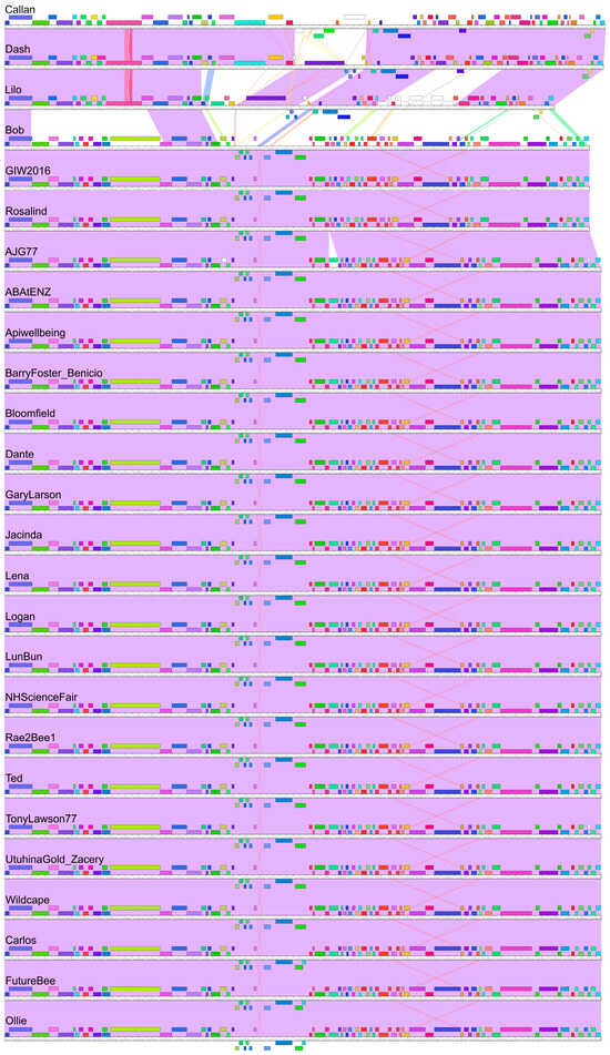 Genome maps were constructed with a Phamerator for the purposes of identifying conserved and divergent regions between phages (Figure 4). Phages Callan and Dash show a high degree of sequence conservation across the majority of their genomes. The most significant synteny break is in the middle of these genomes and contains five genes in Callan and three in Dash. In both Dash and Lilo, this region contains a P. larvae toxin, Plx1 (investigated further below), which contributes to pathogen virulence (large dark purple gene in Figure 4), but which is absent in Callan. Phage Lilo also has two other regions that differ from phages Callan and Dash.