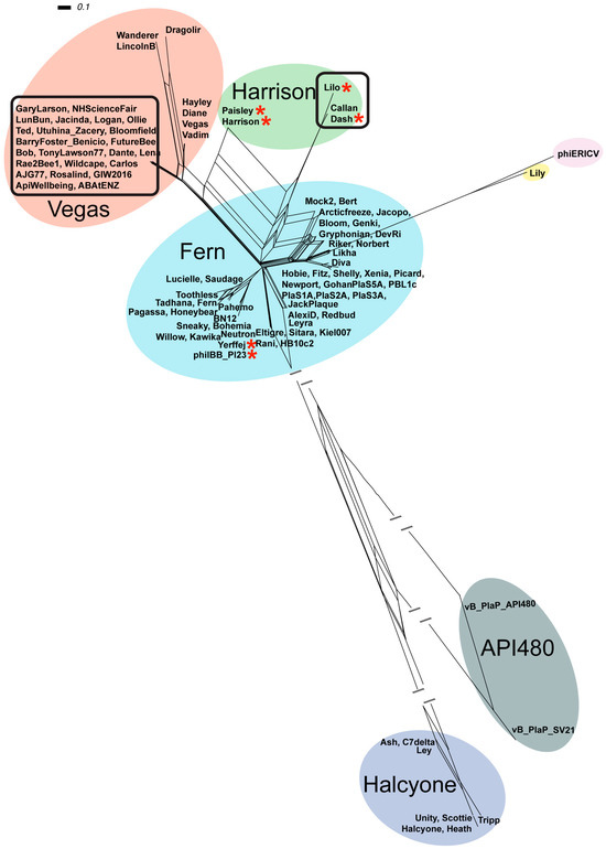 The 96 sequenced P. larvae phage genomes were clustered by PNI (Supplementary Table S3), and total ANI, which was then used to generate a SplitsTree (Figure 5). With both methods, the 96 P. larvae phages fall into five clusters and two singletons. Four of the five clusters have previously been discovered and have been named after a “representative” phage from each cluster (Fern, Harrison, Vegas, Halcyone) [24]. The new cluster consists of vB_PlaP_API480 and vB_PlaP_SV21, while Lily and phiERICV are singletons, the latter being new since the work undertaken by Stamereilers et al. in 2018 [24].
