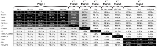 Amino acid identity of the 13 distinct P. larvae phage large terminase genes distributed into seven distinct phams. Phages whose large terminase gene is 100% identical to those in the figure are not included.
