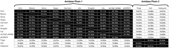Amino acid identity of 13 distinct P. larvae phage N-acteylmuramoyl-L-alanine amidase genes distributed into two distinct phams. Phages whose N-acteylmuramoyl-L-alanine amidase gene is 100% identical to those in the figure are excluded.