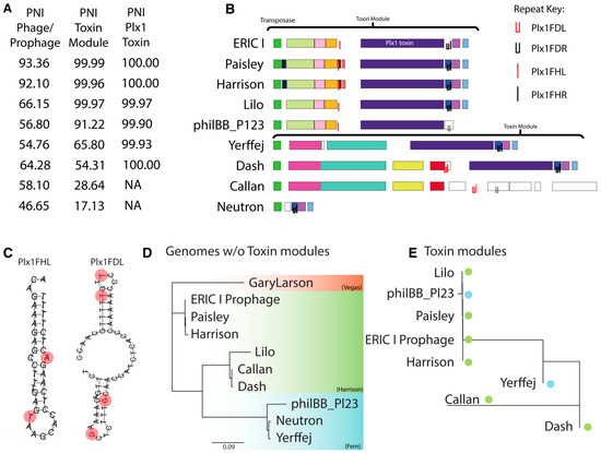 The toxin and its associated module and repeat structure. (A) Column one, Percent aligned nucleotide identity (PNI) of each of the phages and prophages listed in B relative to the prophage in P. larvae ERIC I (ATCC 9545). Similarly, the corresponding toxin modules (see diagram in (B)) in column two and the toxins in column three, all relative to the same in P. larvae ERIC 1 (ATCC 9545). (B) The genome maps of the putative toxin module. These are simplified genome maps and some genes are on the opposite strand. Gene colours correspond to phamerator maps in Figure 9. See key for the identities of the four repeat sequences (see Supplementary Table S4). Lighter colours indicate less than 100% identity to described repeats. (C) Hairpins formed by repeat sequences for Plx1FHL and Plx1FDL made in VectorBuilder (https://en.vectorbuilder.com (accessed on 9 December 2024)). Red circles indicate bases that differ between the left and right repeat sequence. (D) Phage Tree based on PNI showing phage genomes with the toxin module removed. GaryLarson is included as an outgroup from the Vegas cluster. (E) Gene tree based on the PNI of the toxin module alone. GaryLarson and Neutron are not contained within the toxin module tree as neither contain the module.