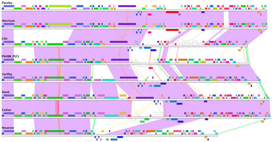 Genome maps of eight P. larvae phages displayed using Phamerator. The Plx1 toxin gene is shown as dark purple and located close to the middle of Dash, Lilo, Harrison, Paisley, phiIBB_Pl23, and Yerffej and absent in Neutron and Callan. Colours as described in Figure 4 (https://phamerator.org (accessed on 9 December 2024)).