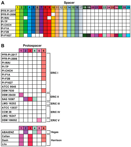 As previously reported, CRISPR systems were found in the P. larvae bacterial strains used to isolate the New Zealand phages [28]. We used CRISPRFinder to detect 29 unique spacers in the eight bacterial genomes that were used to isolate the New Zealand phages (Figure 10A). The sequences of all spacers can be found in Supplemental Table S5. To ascertain if the New Zealand phages contained the 29 spacers identified in our bacterial genomes, we searched their genomes for protospacers using the scan function in DNA Master. We also searched our New Zealand phages for spacers found within nine P. larvae strains with complete genomes sequences in NCBI GenBank (Supplementary Table S2). These spacers had previously been identified [51].