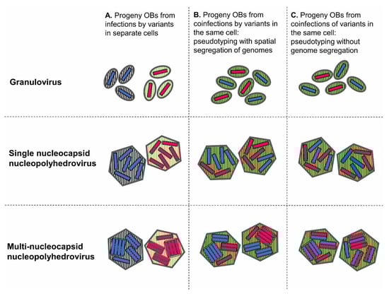 - Clavijo, G.; Williams, T.; Muñoz, D.; Caballero, P.; López-Ferber, M. Mixed genotype transmission bodies and virions contribute to the maintenance of diversity in an insect virus. Proc. R. Soc. B Biol. Sci. 2010, 277, 943–945. [Google Scholar] [CrossRef]