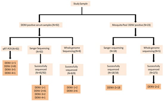 From the serum samples that tested positive for NS1, total RNA was extracted using TRIzol reagent (Sigma-Aldrich, St. Louis, MO, USA; Cat. # T3934) according to the manufacturer’s protocol. Then, using an iScript cDNA synthesis kit (Bio-Rad Laboratories, Hercules, CA, USA; Cat. #1708897), 10 µL of the extracted RNA was converted into cDNA. DENV-specific RT-PCR primers were used to amplify the 511 base pair region of the CPrM gene []. This 511 bp of CPrM region was sequenced using the Sanger sequencing method (Supplementary Figure S2). The whole genome of the dengue virus was sequenced using Illumina sequencing by the method described previously (Figure 2) [].