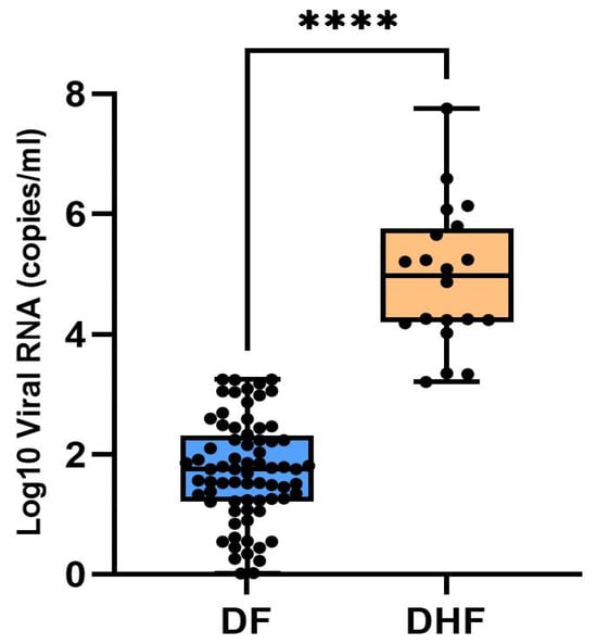 Viral load difference between DF and DHF patients (**** p < 0.0001).