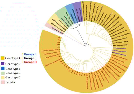As evident, DENV-2 sequences were categorized into six genotypes []. The studied isolates generated using Sanger sequencing during the period of September 2019 to November 2023 (n = 41) were classified as Cosmopolitan or genotype 4 (lineage III) (Figure 6). This genotype contains three geographically distinct lineages: lineage I (Australian, Indonesian, Brunei), lineage II (isolates from Southeast Asia, China, and Oceania), and lineage III (isolates mostly from the Indian subcontinent). Present DENV-2 sequences from Bhopal were attributed to lineage III, clustering mostly with Indian strains. Conversely, other isolates (OR215476, OR215472, OL597875, OR215475, OR215474, OL597880, OL597882, OR215487, and OR215484) were also circulated in the same region and grouped in the same lineage (lineage III), while isolates from 2016 (MH051272-MH051275) were clustered in genotype lineage II.