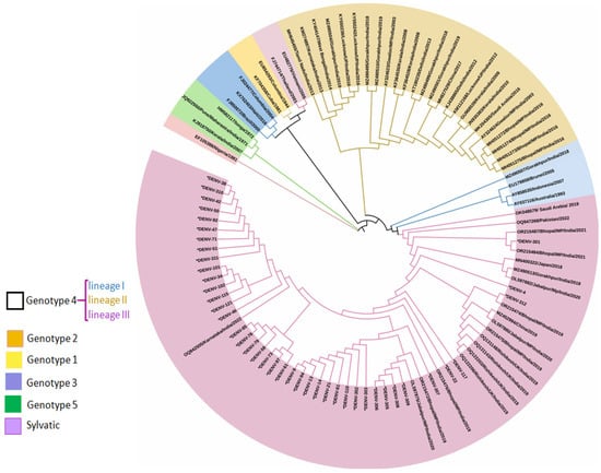 Dengue is the most prevalent acute febrile illness transmitted by arthropods, caused by the dengue virus, with approximately 390 million new cases reported annually []. Female Aedes mosquitoes carrying the dengue virus (DENV) are the main vector of transmission []. There are four different serotypes of DENV: DENV-1, DENV-2, DENV-3, and DENV-4. Based on genetic and antigenic differences, these serotypes are further divided into different genotypes [,] with a ~30% inter-serotype variability [,]. Clinical signs and symptoms of DENV infections range from low-grade fever to severe hemorrhagic fever and even death []. The symptoms usually appear 5–8 days after an incubation period of 3–15 days. Clinical manifestations of dengue can range from an infection with no symptoms to a serious, potentially fatal illness if left untreated []. Expanded dengue syndrome, dengue fever, dengue hemorrhagic fever (DHF), dengue shock syndrome (DSS), undifferentiated febrile disease, and atypical dengue are the classifications used to describe cases []. Children, expectant mothers, and the elderly, particularly those with concomitant conditions like diabetes or hypertension, are among the groups most at risk of contracting dengue.