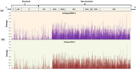 HIV sequences database software (https://www.hiv.lanl.gov/cgi-bin/ENTROPY/entropy.cgi, accessed on 20 May 2024) was used to examine the Shannon entropy of DENV-1 and DENV-2. The probability of disorder or variation at a certain amino acid position in protein sequences is increased by the amino acid’s entropy []. The entropy graph was then created by manually editing values from an online software database into Microsoft Excel sheets.