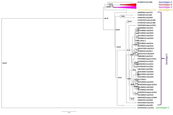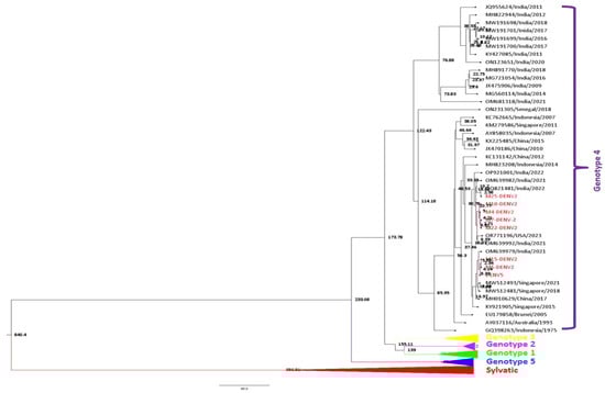 DENV-4, a rare serotype in India, was detected in the early 1960s in Vellore, Tamil Nadu [], and responsible for a few outbreaks in Kanpur (1968–1969) [] and Andhra Pradesh (2007) []. Serotype 4 is divided into five genotypes, and only study isolates from Bhopal were clustered within genotype I (Supplementary Figure S6), alongside isolates from other Asian countries (Sri Lanka, Thailand, Singapore, Cambodia, China, Pakistan, and the Philippines).