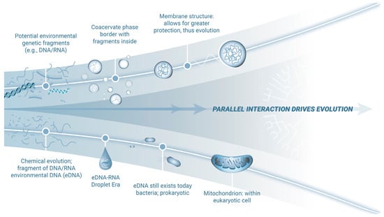Impact of eDNA on the evolution and adaptation of mitochondria. Primordial eDNA-RNA likely formed via a thermodynamically favorable environment providing for relatively stable coacervate-like droplets. In this environment, genetic fragments would concentrate, interact, and facilitate novel base pairing in relative protection. Evidence suggests these fragments persist today, detectable in wastewater, intracellular and extracellular spaces, and mitochondria []. Additionally, bacterial and viral genetic material is present in human introns. Over time, in the primordial environment, these coacervate-like droplets evolved stable membranes, offering enhanced protection for genetic processes to progress strategically. Crucially, the reciprocal exchange of information with mitochondria, descendants of bacteria, likely enabled flexible, high-yield energy processes while mitigating the toxicity of photosynthesis-derived oxygen, offering a significant survival advantage. Thus, mitochondria became just one of the successful end products of this evolutionary process.
