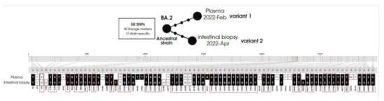Microevolution of the BA.2 strain in the intestinal biopsy and plasma compartments. Plasma (variant 1) and intestinal biopsy (variant 2) specimens diverged from an ancestral strain. Both specimens share fifty-eight fixed SNPs (forty-five BA.2 markers and thirteen strain-specific) and differ in five fixed SNPs (three SNPs in variant 1 and two SNPs in variant 2). Consolidated (fixed SNPS with a frequency above 80%) are represented by black squares and circles, while unconsolidated SNPs (heterozygous calls) are represented by white squares. BA.2 lineage markers are depicted within red boxes.