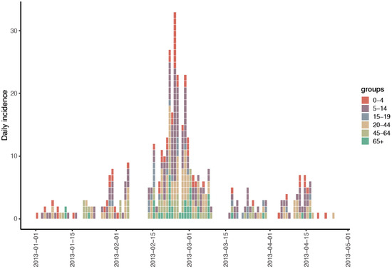 A total of 2407 ILI episodes were reported during the 2012/13 influenza season (from October 2012 to June 2013). Figure 1 shows the distribution of ILI cases by age group during the study period.