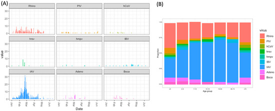 Table 1 displays the characteristics of the samples collected. Out of 2396 ILI samples collected, 2316 samples were available for molecular typing of the responsible viral pathogens. The most frequently detected virus was IAV (23.2%, 538/2316), followed by hRV (11.4%, 264/2316). The other viruses detected were hAdV (1.9%,44/2316), PIV (1.9%, 43/2316), BoV (1.1%,26/2316), RSV (0.9%, 20/2316), hCoV (0.6%, 14/2316), IBV (0.9%, 22/2316), and hMPV (0.3%, 8/2316). No viruses were detected in 1427 samples. A total of 105 samples were found to have more than one virus (96 samples with two viruses, 5 samples with more than two viruses). The finding of IAV was at its peak between late February and May, and RV was observed at almost the same frequency throughout the study period (Figure 2A). hRV was the most common virus among the young age group (<3), and IAV was the most common virus among the other age groups (Figure 2B, Supplementary Table S1).