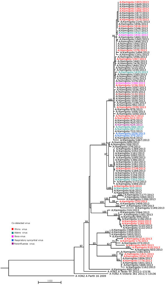 We checked whether the A/H3N2 influenza clustered phylogenetically by co-detection with another respiratory virus. If the virus–virus co-detection enhanced the antigenic variations, we would expect to see the antigenically distinct variants clustering together by the virus–influenza co-detection in phylogenetic trees. We therefore analyzed individual consensus sequences, as well as whole-genome sequences, from 132 available WGS cases (Figure 3, Supplementary Figure S3). There was very little diversity among the samples, and we found that all types of virus detection (i.e., influenza alone or influenza in co-detection with other respiratory viruses) were dispersed throughout the phylogenetic tree.
