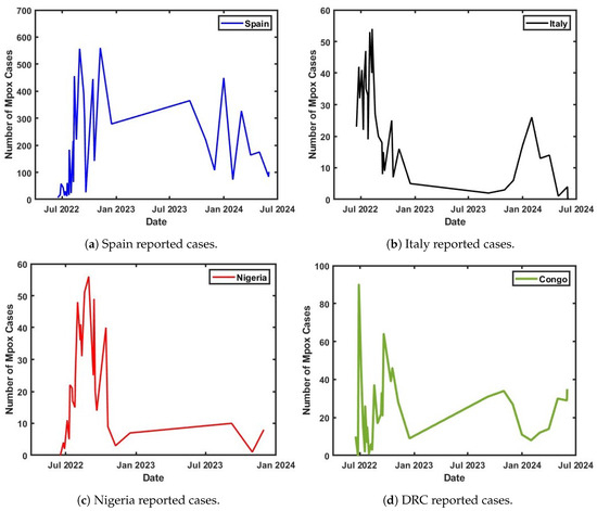The formulated Clades I and II epidemiological model was rigorously validated, with its reliability confirmed through the use of published data from the World Health Organization (WHO) on Spain, Italy, Nigeria, and the Democratic Republic of the Congo (DRC) [4,38]. This validation process employed a non-linear least-squares method (NLSM) curve-fitting technique to estimate the optimal values of key unknown parameters. The model was calibrated using weekly confirmed cases from these countries, representing the number of infectious individuals. Prior to the model validation, a time-series analysis of the published data was conducted, highlighting the trends in weekly reported cases through a 7-day moving average, shown in Figure 2a. The visualized time series also captures the weekly progression of Mpox cases for each country, as shown in Figure 2b,c, and provides an overall comparative analysis, depicted in Figure 2. This approach helped to identify patterns and anomalies in the spread of the disease before the model was fitted to the observed data.