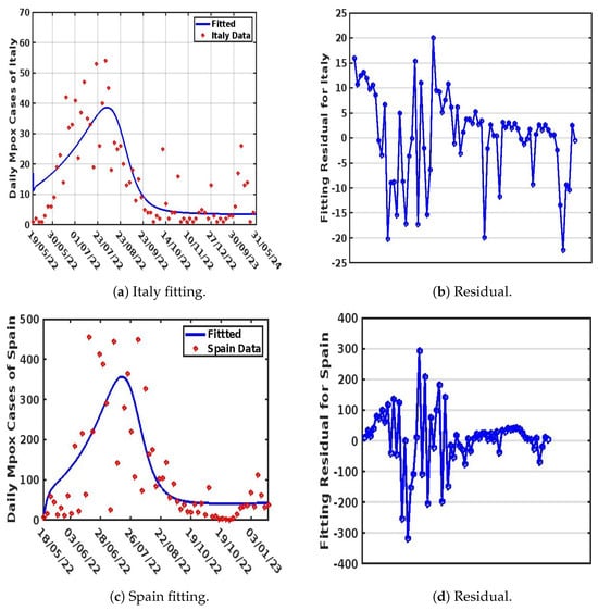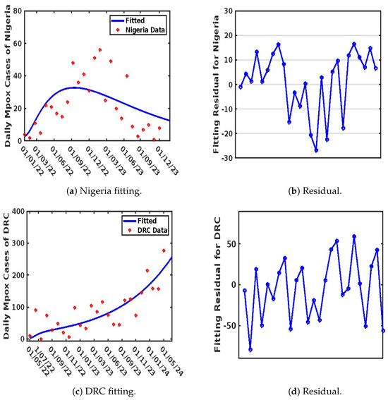 It is important to note that parameter selection was guided by their significance in capturing the transmission dynamics of Mpox, particularly in a population with more than one strain of the virus. We used the residual function from the MATLAB Optimization Toolbox to generate the residual plots shown in Figure 3b,d and Figure 4b,d. These plots demonstrate a justified trend, with residuals evenly scattered above and below the y-origin. Residuals are essential for identifying outlying y-values and validating the linear regression assumptions concerning the error term in the regression model. High-leverage observations usually have smaller residuals as they tend to pull the regression line or surface closer to them, representing the vertical distance between the observed data and the fitted curve. Thus, when the residuals are randomly scattered around the y-origin, it indicates a justified fitting, as illustrated in Figure 3a,c and Figure 4a,c.
