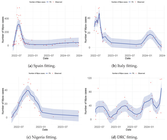 where can belong to any exponential family distribution, which, in this context, represents the weekly reported cases of Mpox in Spain, Italy, Nigeria, and the Democratic Republic of Congo (DRC). The error term, , is assumed to follow a normal distribution, ∼, with a mean of 0 and constant variance . The term represents the intercept and are smooth functions of the predictors , which, in this case, represent time measured in weeks. Using the GAM function in the R software [40], we represent the smooth function as the Gaussian process smoothed using 20 knots, and ciTools was used to estimate the confidence interval (CI).