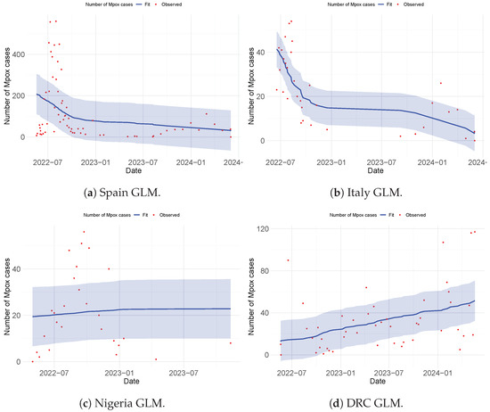 Generalized linear models (GLMs) are statistical models that fit a linear response function , which, in this context, represents the weekly reported cases of Mpox in Spain, Italy, Nigeria, and the Democratic Republic of Congo (DRC) as a linear combination of the predictors . In this case, the predictors represent time measured in weeks. The model accounts for errors , which are assumed to be normally distributed [40]. A generalized linear model can be expressed as follows: