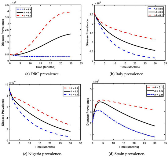 In this section, we evaluate the effect of varying the parameter , which represents the proportion of individuals infected with either Clade I or Clade II of the Mpox disease. Figure 7 illustrates a scenario where both Clades coexist within the population. The figure reveals that the prevalence of Mpox in the DRC is strongly influenced by the dominant Clade. Notably, the prevalence is highest (indicated by the red dashed line) when 90% of the population is infected with Clade I. When the proportions of both Clades are equal (black solid line), the prevalence is higher than when Clade II constitutes only of the infections (blue dash-dotted line). Additionally, as shown in Figure 7a, there is a steady increase in prevalence over time (red dashed line), rising from 0.5 million to 3.8 million individuals within 2.5 years. In Figure 7b, a similar pattern can be observed in the Italian population, where the prevalence of Mpox decreases as increases from 0.1 to 0.9. This corresponds to a decline in Italy’s basic reproduction number (), with values of 0.7653, 0.4277, and 0.0900, respectively, within the same period. This indicates that the prevalence of Mpox in Italy is strongly influenced by the dominance of Clade I. Specifically, when of the population is infected with Clade I (represented by the red dashed line), the prevalence is highest. Furthermore, it is observed that, when the proportions of both Clades are equal (represented by the black solid line), the prevalence remains higher compared to in the scenario where Clade II accounts for only of the infections (represented by the blue dash-dotted line).