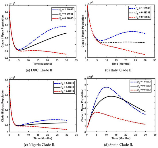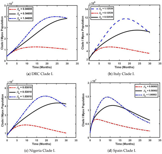 In this section, we assess the impact of the effective contact rate on the prevalence of Mpox Clade II using the formulated model (4) and the parameters presented in Table 2 and Table 3. In Figure 9, the effective contact rate is . Figure 9a–c show a sharp decline in the dominance of Clade II in the populations of Italy, the DRC, and Nigeria within the first five years. Following this decline, a slight increase in the number of individuals infected with Clade II is observed. On the contrary, Figure 9d reveals a distinct trend. An increase in leads to a corresponding rise in the dominance of Clade II in Spain’s population. Specifically, when the effective contact rate is increased from its baseline value of 0.06902 to 1.06902 (a 100% increase), the number of infected individuals with Clade II surges dramatically. In Spain, infections rise from 0.8 million to 7.8 million within the first year (i.e., 12 months) of Clade II’s emergence, before declining to 3.4 million within 1.5 years. This insight highlights the need for immediate and robust mitigation strategies in Spain to prevent the widespread transmission of Mpox Clade II. The Spanish government should prioritize vaccination programs, early detection mechanisms, and effective treatment plans to manage the outbreak and minimize its impact on the population.