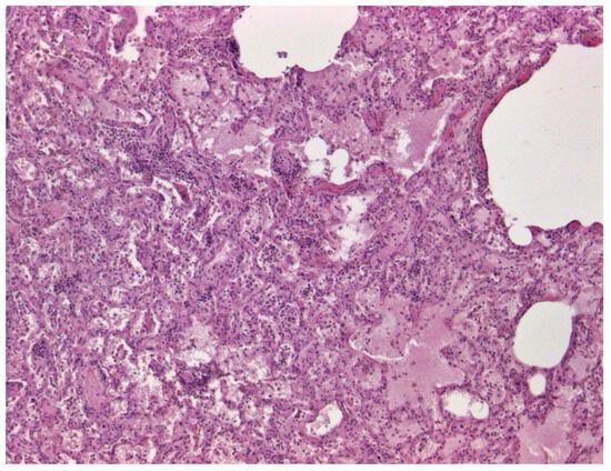 Necropsy findings in Dog 1 revealed congestion in several abdominal organs, including the intestinal tract, spleen, kidneys, and urinary bladder. The kidneys showed adhesions at decapsulation and a marked reduction in corticomedullary differentiation. The liver appeared haemorrhagic and decreased in consistency, while the lungs showed congestion and hepatisation of the right middle lobe. A pinkish frothy fluid was observed on the lung incision, consistent with alveolar oedema, further supporting the presence of significant pulmonary pathology. The lungs showed diffuse, generalised alveolar oedema that significantly impaired respiratory function. In addition, there was mild to moderate infiltration of mononuclear inflammatory cells in both the peribronchiolar region and the alveolar spaces (Figure 1). The spleen showed mild to moderate lymphoid depletion.