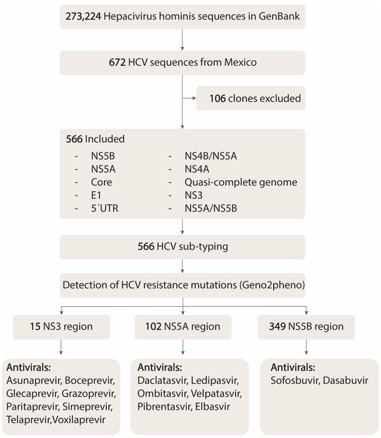 A comprehensive dataset was retrieved from GenBank (https://www.ncbi.nlm.nih.gov/labs/virus/vssi/#/, accessed on 10 May 2024) to investigate the genetic diversity and antiviral resistance using the query (“Hepacivirus hominis” [Organism] OR hepatitis C virus [All Fields]) AND (“Hepacivirus hominis” [Organism] OR HCV [All Fields]). By 11 September 2024, 273,224 HCV sequences had been reported, of which 672 originated from Mexico. Redundant sequences and those labeled clones (n = 106) were excluded from the analysis. The final dataset included 566 sequences, from which information such as state of origin, genomic region, HCV genotype, and year of deposit in GenBank was collected (Figure 1).