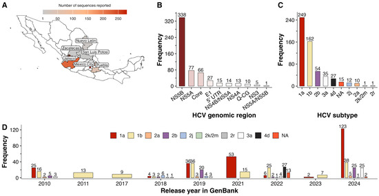 Epidemiology of HCV in Mexico based on GenBank sequences. Geographic distribution of reported HCV sequences (A). Frequency of HCV genomic regions sequenced (B) and distribution of HCV subtypes (C). Temporal trends in HCV subtype prevalence from 2010 to 2024 (D). Q-CG: Quasi-complete genome, NA: Not available, 2k/2m refers to the recombinant HCV subtype.