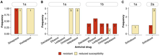 Frequency of resistance and reduced susceptibility mutations to antiviral drugs by HCV subtype based on NS3 (A), NS5A (B), and NS5B (C) regions.