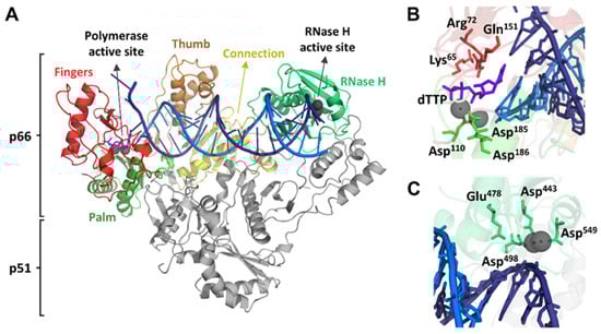 Retroviral RTs are structurally diverse. The best characterized enzyme is the HIV-1 RT. Currently, the number of crystal structures of this enzyme deposited in the Protein Data Bank is close to 200 and includes complexes of wild-type and mutant RTs with selected inhibitors, as well as binary (RT-DNA/DNA and RT-RNA/DNA) and ternary complexes (e.g., RT-DNA/DNA-dNTP) containing different types of nucleic acids (for a recent review, see [18]). The HIV-1 RT is an asymmetric heterodimer composed of subunits of 66 and 51 kDa, termed as p66 and p51, respectively (Figure 1). The p66 subunit contains a DNA polymerase domain spanning residues 1–440 and an RNase H domain including residues 441–560. Catalytic sites of the DNA polymerase and RNase H activities are located in p66. Active DNA polymerase residues are Asp110, Asp185 and Asp186, while the catalytic residues responsible for the cleavage of RNA in RNA/DNA complexes are Asp444, Glu478, Asp498 and Asp549. Both catalytic sites coordinate divalent cations (Mg2+ in physiological conditions, although Mn2+ binding can be observed in some structures). The p51 subunit has the same amino acid sequence as p66 but lacks the RNase H domain and has a structural role while contributing to enzyme dimerization [19].