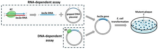 Forward mutation assays assess the fidelity of RTs by detecting nucleotide changes across many sites within a reporter gene [39]. This method typically involves the use of a gapped dsDNA template from phage M13mp2, where the lacZα gene in one of the two strands is missing. The gapped DNA serves as template for DNA-dependent DNA synthesis to obtain the complementary strand of the lacZα gene (the antisense strand of the gene). The resulting DNA is then used to transform Escherichia coli cells, which are then plated on X-Gal indicator plates. Mutations can be identified by altered plaque color, such as light blue or colorless, indicating a loss of β-galactosidase activity because of errors introduced by the RT. If desired, DNA from mutant plaques can be purified and sequenced by Sanger sequencing to determine the specific mutations introduced. The method can also be adapted to study RNA dependent DNA polymerase fidelity (Figure 2).