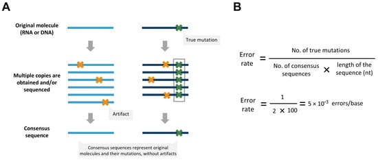 Rationale of consensus sequencing. (A) Error correction of consensus sequencing. Depending on the method, multiple copies of an original molecule (DNA or RNA) are obtained and sequenced, or the molecule is sequenced several times. Sequences that derive from the same molecule are aligned, and a consensus is established. True mutations from the original molecule, which are expected to be present in all copies, are added to the consensus. On the other hand, artifacts, which are expected to be inconsistent across the copies, are discarded. (B) Formula to calculate error rates. Once consensus sequences are obtained, an accurate error rate can be calculated. If we consider that the consensus sequences shown on the left have a length of 100 nt, the error rate of the original molecules would be 5 × 10−3 errors/base.