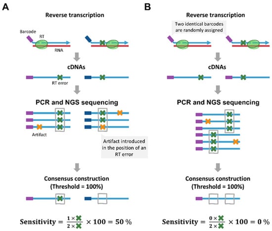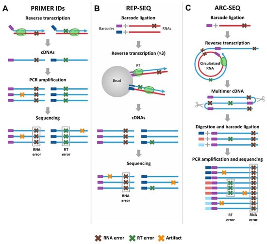 Barcoding of cDNA molecules is a fast, effective and widely used strategy, initially described as the “PRIMER IDs” method by Jabara et al. [49]. This technique was first applied to identify minority variants found in viral genomic RNA from HIV-infected patients. Later, this approach was used by several labs to identify RT errors and measure RT error rates [31,51,52,53,54,55,56]. The procedure is summarized in Figure 4A. Reverse transcription is performed to generate cDNAs using primers that incorporate a unique barcode at their 5′ end. This process renders cDNAs tagged with different barcodes and ensures that each cDNA molecule is uniquely identified. The barcoded cDNAs are then amplified via PCR, followed by sequencing. Reads sharing the same UMI are grouped together, allowing for the identification of mutations that are consistently observed within each group. These mutations are considered to be original errors present in the cDNA molecule, as they are likely to have arisen during the transcription or reverse transcription processes.