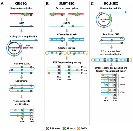 However, as found in the case of the “PRIMER IDs” method, error rates obtained with CIR-SEQ would reflect the cumulative errors introduced during the reverse transcription process. The CIR-SEQ method has also been adapted to study RNA mutations [66,67,68,69]. In those adaptations (also named CIRC-SEQ), tandem-repeat cDNAs are directly obtained from RNA molecules via rolling circle reverse transcriptions. These multimeric cDNAs are sequenced and are then analyzed the same way as described above, but mutations identified in consensus sequences will only represent RNA errors.