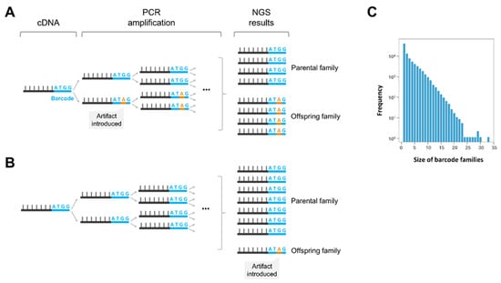 Effect of mutations in barcodes on the generation of offspring barcodes. (A) Impact of introducing an artifact in a barcode during the early PCR cycles. (B) Impact of introducing an artifact in the later PCR cycles or during sequencing. (C) Barcode frequency distribution in a typical NGS experiment. Ordinate values are represented on a logarithmic scale. Adapted from [56].