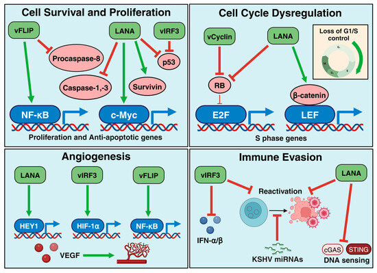Another latent protein encoded by KSHV ORF72 is vCyclin, a homolog of cellular cyclin D [92]. vCyclin has a role in cell cycle regulation and cell survival. Specifically, vCyclin can bind and activate various cyclin-dependent kinases (CDKs) like CDK6 and CDK4, although it has a stronger affinity for CDK6 [93]. This activation of CDK6 has been shown to specifically phosphorylate various cellular targets like Rb, histone H1, and nucleophosmin, impacting cell cycle progression into the S phase as well as transcriptional control [93,94]. Furthermore, vCyclin-induced activation of CDK6 is resistant to CDK inhibitors [95]. It has also been demonstrated that vCyclin overrides contact inhibition to promote cell growth and tumorigenesis [96].