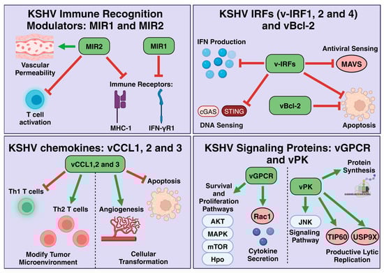 Th1 and Th2 are two subsets of CD4+ T cells that have important roles in orchestrating an immune response. Th1 cells are essential in combatting viral infections as they are the coordinators of cellular immunity, playing a key role in activating immune cells (i.e., cytotoxic T cells and macrophages) to kill infected cells. Th2 cells, on the other hand, play a supporting role in humoral immunity by promoting B-cell activation and the production of IgE antibodies, which are much less effective against intracellular pathogens like KSHV. In the context of KSHV infection, the vCCL proteins preferentially sequester more of the less effective Th2 cells through their specific interactions with Th2-specific receptors. This results in a modified tumor microenvironment that is void of the inflammatory Th1 cells and characterized by a dampened T-cell response [247,248]. The vCCLs also promote angiogenesis in a VEGF-dependent manner and they enhance cell survival by downregulating the expression of the pro-apoptotic protein, Bim [249,250].