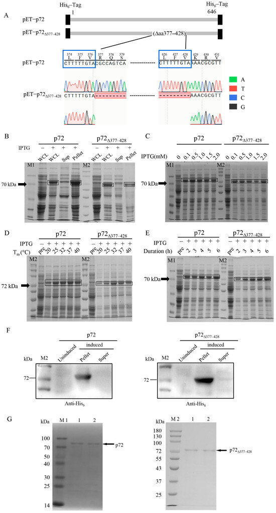 The expression of recombinant p72 and p72∆377–428 proteins. (A) A diagram and sequencing of recombinant constructs pET-p72 and pET-p72∆377–428. (B–E) The recombinant p72 and p72∆377–428 proteins were analyzed on 10% SDS-PAGE gels and visualized with coomassie blue staining. (B) Expression analysis of p72 and p72∆377–428 by SDS-PAGE. The induced expression conditions for all samples were 1.0 mM IPTG, 4 h, and 37 °C. The data are representative of three independent assays. The contribution of IPTG concentration, temperature, and induction duration to the expressions of p72 and p72∆377–428. (C–E) SDS-PAGE analysis of the effects of IPTG concentration (C), induction temperature (D), and induced time (E) on the protein yields. (C) Conditions of 37 °C, 4 h, and various concentrations of IPTG; (D) conditions of 1.0 mM IPTG, 4 h, and different temperatures; (E) conditions of 37 °C, 1.0 mM IPTG, and different induction times. WCL: whole-cell lysate; Sup: supernatant; pre: pre-induction. (F) Identification of p72 and p72∆377–428 by immunoblot with an anti-6*His antibody; (G) SDS-PAGE analysis of purified p72 (left panel) and p72∆377–428 (right panel) proteins. M1/M2: 100kD/180kD protein molecular weight standard. Lane 1/2: purified proteins.