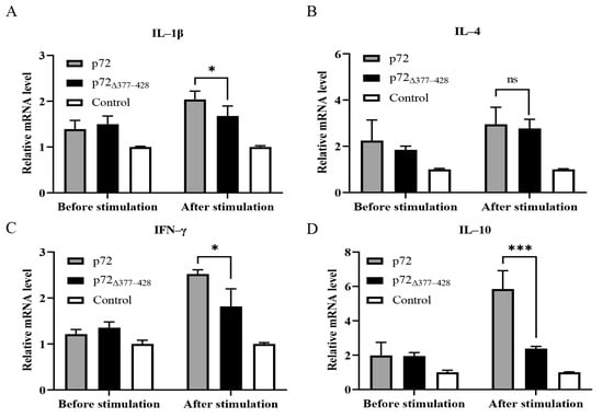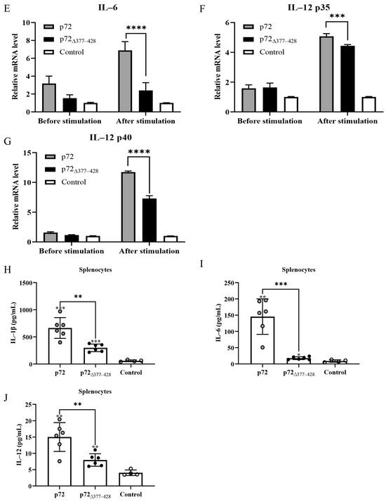 Since p72∆377–428 reduced the secretion of IFN-γ compared to p72, we investigated whether p72∆377–428 affected the expression of pro-inflammatory cytokines. Therefore, we performed qRT-PCR assays to examine the transcription levels of Th1 (IL-1β, IFN-γ, IL-6, and IL-12) and Th2 (IL-4 and IL-10) cytokines in mouse splenocytes upon immunization with different proteins. Compared with the p72-immunized group, the p72∆377–428 -immunized group elicited a lower level of IL-1β, IFN-γ, IL-6, IL-10, and IL-12 (Figure 5A–G). To further evaluate the expression of pro-inflammatory cytokines, after splenocytes were harvested from mice immunized with the p72 or p72∆377–428 protein and stimulated by purified proteins in vitro, the secretion of IL-1β, IL-6, and IL-12 from the cell supernatant was examined by ELISA. As shown in Figure 5H–J, p72∆377–428 triggered reduced secretions of IL-1β, IL-6, and IL-12 compared with p72. Taken together, these findings revealed that the deletion of aa 377–428 within p72 reduces the induction of pro-inflammatory cytokines in mice.