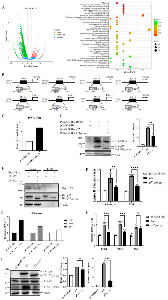 Since we have demonstrated that p72∆377–428 reduced the production of pro-inflammatory cytokines including IFN-γ compared to p72, the question of how p72∆377–428 caused these effects arose. To address this question, the cellular transcriptome change caused by p72 was analyzed by HTSeq. A total of 1783 genes exhibited statistically significant changes (fold change > 2 and q value < 0.05) (Figure 6A, left panel). The statistical enrichment of differentially expressed genes showed that HIF1α and PI3K/AKT were regulated by p72 (Figure 6A, right panel). HIF1α has been reported to bind the core consensus sequence 5′-(A/G)CGTG-3′ within the hypoxia response element (HRE) present in many genes including pro-inflammatory cytokines [32,33,34]. We observed the potential HREs in the core promoter of pro-inflammatory cytokines including IFN-γ, IL-1β, IL-6, and IL-12 (Figure 6B). Among these differentially expressed genes revealed by transcriptome analysis, the mRNA level of HIF1α was upregulated by p72 (Figure 6C). HIF1α has been reported to regulate the production of IFN-γ and IL-1β [35,36]. Therefore, it is reasonable that p72 could enhance the expression of pro-inflammatory cytokines IFN-γ, IL-1β, IL-6, and IL-12 via the HIF1α pathway. To determine whether p72 regulated HIF1α expression and whether its aa 377–428 participated in the regulation, 293T cells were co-transfected with the plasmids expressing HIF1α and p72 or p72∆377–428. As shown in Figure 6D, overexpression of p72 dramatically increased HIF1α expression, while a weaker HIF1α increase pattern was detected for p72∆377–428. Under normoxic conditions, HIF1α is continuously degraded, resulting in low basal HIF1α levels [30]. We also investigated whether there was an interaction between p72 and HIF1α to prevent HIF1α degradation, and whether the aa 377–428 of p72 was involved in this interaction. Immunoprecipitation indicated that there was no interaction between p72 and HIF1α (Figure 6E). Further qRT-PCR confirmed that p72 exhibited stronger induction of HIF1α transcription than p72∆377–428 in mouse splenocytes and 293T cells (Figure 6F). To analyze how p72 affected HIF1α transcription, we examined the signaling pathways regulated by p72 and found that the PI3K/AKT signaling pathway was enriched (Figure 6A, right panel). The results from RNA-sequencing and qRT-PCR indicate that the transcriptions of PI3K/AKT-related AKT, PDK1, and RPS6 were increased by p72 (Figure 6G,H). PDK1 can activate AKT via phosphorylation at its Thr308, and RPS6 can regulate HIF1α expression [51,52]. Since the PI3K/AKT signaling pathway has been reported to regulate HIF1α transcription [53], we hypothesized that p72 expression would increase HIF1α transcription via the AKT signaling pathway. To test this hypothesis, we examined the impact of p72 and p72∆377–428 expression on AKT by immunoblotting. p72 expression increased the level of AKT and phosphorylated AKT proteins, and the deletion of aa 377–428 significantly reduced phosphorylated AKT proteins (Figure 6I). Taken together, these results suggest that the aa 377–428 of p72 participates in the regulation of pro-inflammatory cytokines via the AKT/HIF1α pathway.
