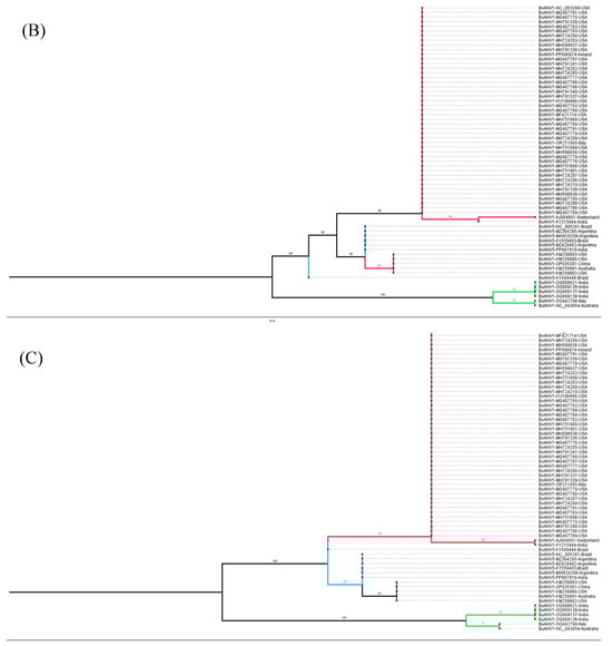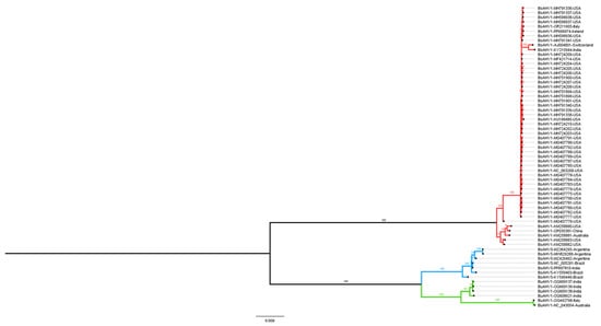 Phylogenetic relationship between sixty-five bovine and bubaline alphaherpesvirus complete genomes. Each sequence is shown as a black dot and is followed by its name, the GenBank accession number, and country of origin. Red lines indicate BoAHV1; blue lines, BoAHV5; and green lines, BuAHV1. Phylogenetic analysis was performed using the maximum likelihood method in the IQ-TREE v2.0.3 Database with the settings for 1000 bootstrap replicates. Numbers associated with particular branches indicate the percentage of 1000 bootstraps.