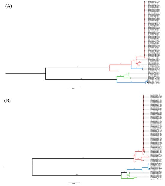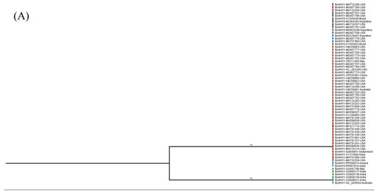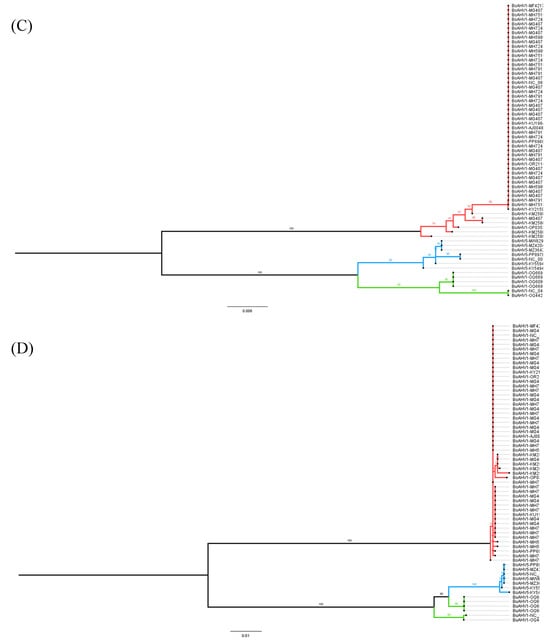 - Rambaut, A. FigTree v1.4.4: Tree Figure Drawing Tool. 2009. Available online: http://tree.bio.ed.ac.uk/software/figtree (accessed on 7 October 2024).