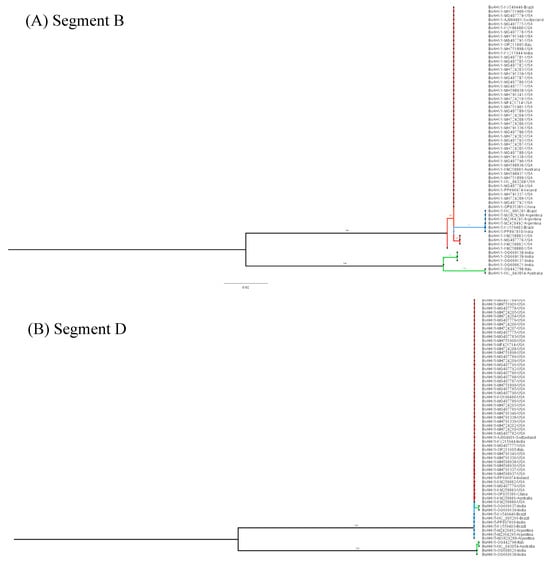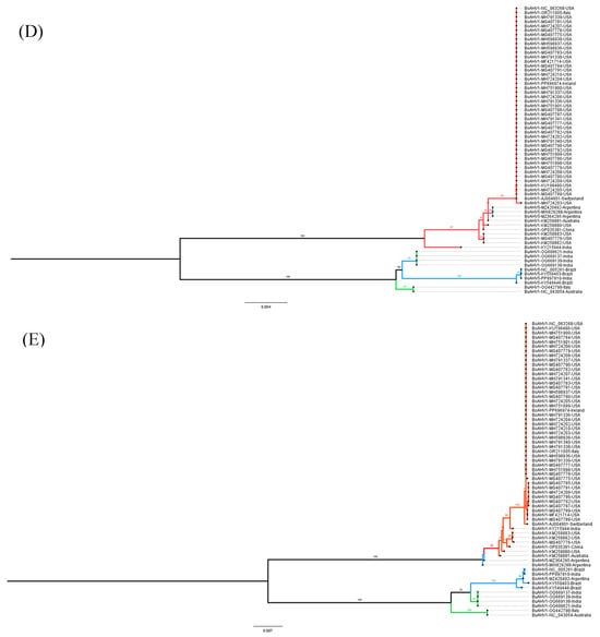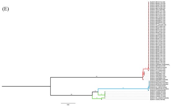 Phylogenetic analysis of BoAHV1, BoAHV5, and BuAHV1 glycoproteins. Alignments were performed with complete gene sequences extracted from full-length genome sequences using MAFFT. Red lines indicate BoAHV1; blue lines, BoAHV5; and green lines, BuAHV1. Phylogenetic analysis was performed using the maximum likelihood method in the IQ-TREE v2.0.3 Database with the settings for 1000 bootstrap replicates. Numbers associated with particular branches indicate the percentage of 1000 bootstraps. All glycoprotein genes analyzed from BoAHV5 were more closely related to BuAHV1 genes than BoAHV1, with the exception of three gB BoAHV5 from Argentinian strains. (A) Glycoprotein B (UL27 gene); (B) glycoprotein C (UL44 gene); (C) glycoprotein D (US6 gene); (D) glycoprotein E (US8 gene); and (E) glycoprotein G (US4 gene).